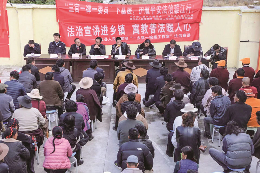 “三官一律一委員”下基層以“五聯(lián)共建”為核心,以政法委員為中心,以雙向報(bào)道、三層處置、三級(jí)監(jiān)督、四區(qū)同治為方法,畫(huà)出了適合雅江實(shí)際的“112334”工作流程圖。