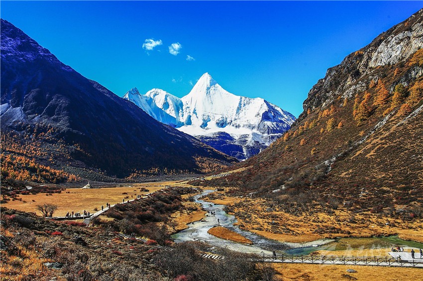 早餐后從稻城出發(fā),翻越海拔4513多米的波瓦山,途徑亞丁村,抵達(dá)目的地亞丁景區(qū)。國(guó)慶節(jié),亞丁景區(qū)迎來(lái)了高峰的人流,排隊(duì)等候景區(qū)大巴車的游客,從大廳排列一直蜿蜒到大門口,經(jīng)過2小時(shí)漫長(zhǎng)的等待,終于抵達(dá)景區(qū),徒步步行到?jīng)_古寺,景區(qū)里已經(jīng)人滿為患,眼前的亞丁秋色,讓我們忽略了身邊擁擠的人群,只顧欣賞由草地、森林、小溪和嘛呢堆組成的天然沖古草坪。沿著沖古寺仰望仙乃日神山而上,往返約3公里步行約2小時(shí),一步一步來(lái)到美如仙境般的珍珠海;返回山下,繼續(xù)乘坐景區(qū)電瓶車到達(dá)洛絨牛場(chǎng),返程順溪流而下。當(dāng)天入住香格里拉鎮(zhèn)日松貢布酒店。