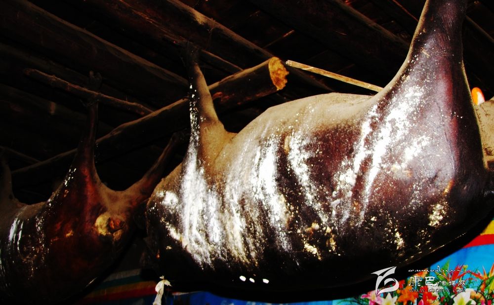 “臭豬肉”的制作過程和來歷:豬用玉米和麥子喂肥后,用繩索套豬頸勒死,在其胸開一小口將豬心血脈弄斷,使肉中的血全部流回到內(nèi)臟中,再把所有的內(nèi)臟從小口中取出,并填上青稞、麥子等谷物后縫合,再用灶灰和紅土塞住七竅,把氣吹脹,埋在麥糠中10余天吸干水,取出掛在灶上的房梁上自然煙熏數(shù)年即成。其懸掛年限可達(dá)10年以上,最長(zhǎng)的可達(dá)30余年。食用時(shí),隨用隨取,做法也很多,可生吃,可煮食,也可熬湯。扎壩人多愛生吃,初嘗入口難適,多食后方覺滿口濃香,回味無窮。過去是為防備戰(zhàn)事而儲(chǔ)備食品,后來就逐漸成為當(dāng)?shù)氐囊环N飲食習(xí)俗和主要食品了。