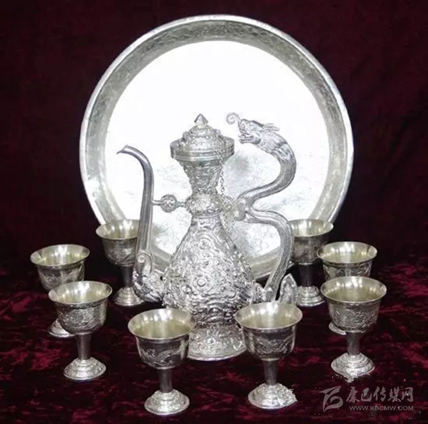 金屬制酒器酒具中關(guān)于銀質(zhì)酒器的說法最多。一種說法是,因?yàn)殂y離子具有消毒功能,所以青稞酒盛在其中不容易變質(zhì),且口感比較醇。銀質(zhì)酒器還分為精心加工過的和未加工過的兩種,使用兩種器具喝酒時(shí)的口感也不同,加工過的口感會(huì)更細(xì)膩一些。除此之外,還有木制的。木制的分為純木制和鑲了金銀銅等邊飾的兩種,林芝、昌都地區(qū)因木材資源豐富而使用較為流行,還有有牦牛角或牦牛皮制的、有陶制的,以及現(xiàn)在很常見的玻璃制的等。