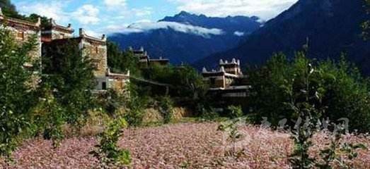 在青山腳下,綠樹(shù)環(huán)抱,小溪流徑之地,遠(yuǎn)遠(yuǎn)地便能看見(jiàn)屋檐下、窗戶的壁墻上勾畫(huà)著象征純潔白線的藏寨民居。一幢幢藏寨民居那么和諧地與大自然構(gòu)成一幅美麗的風(fēng)景。