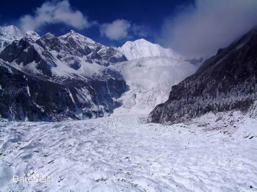 沿冰川上行三公里,繞過黑松林,即可望見這條大冰瀑布。冰瀑布寬達1100米,落差1080米,由無數(shù)極其巨大的光芒四射的冰塊組成,仿佛從藍天直泄而下的一道銀河。除非你親眼見到,沒有任何詞匯能形容它的瑰麗笥偉大。冰川最高點的海撥為6750米,而最下端的海撥高度僅為2850米,它不但是低緯度低海撥的冰川,而且是落差最大的冰川。