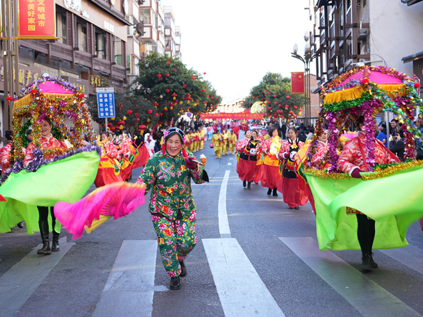 踮腳尖、拍照片、錄視頻、發(fā)朋友圈……街道兩邊的市民和游客都不停重復(fù)著以上動作,各方陣精彩的表演也不斷收獲陣陣掌聲和喝彩聲,現(xiàn)場洋溢著濃濃的春節(jié)氛圍。瀘定市民王強興奮地說,今年的巡游很熱鬧,特別是舞龍方隊氣勢十足,希望新的一年大家都能龍騰虎躍、生龍活虎。